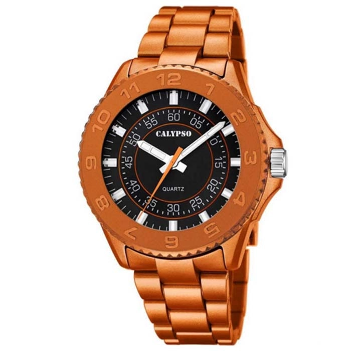 Ένα κομψό ρολόι της CALYPSO από πορτοκαλί ρητίνη με μαύρο καντράν