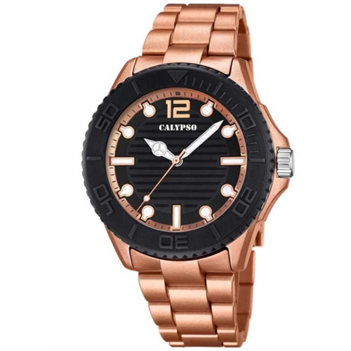 Ένα κομψό ρολόι της CALYPSO από επιχρυσωμένη ροζ ρητίνη με μαύρο καντράν