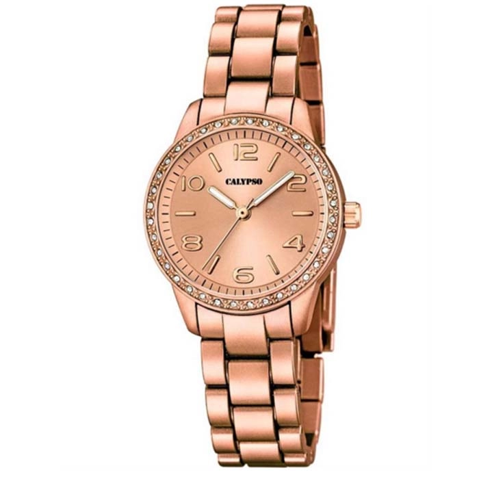 Ένα κομψό ρολόι της CALYPSO από επιχρυσωμένη ροζ ρητίνη με ροζ καντράν