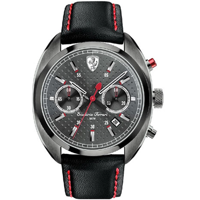 Από τον οίκο Ferrari ένας ξεχωριστός χρονογράφος από μαύρο ανοξείδωτο ατσάλι, ανθρακί καντράν και μαύρο δερμάτινο λουράκι με κόκκινες λεπτομέρειες.