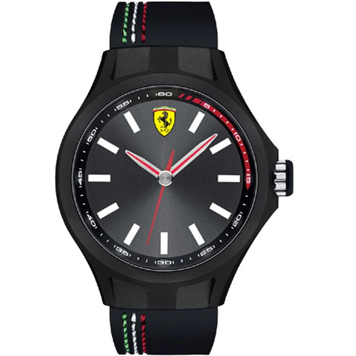 Από τον οίκο Ferrari ένα ρολόι με μαύρο καντράν και μαύρο καουτσούκ λουράκι.