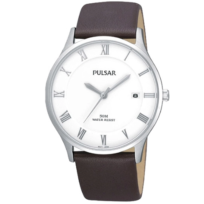 Ένα ρολόι σε κλασσική γραμμή από την PULSAR , από ανοξείδωτο ατσάλι και καφέ δερμάτινο λουράκι.